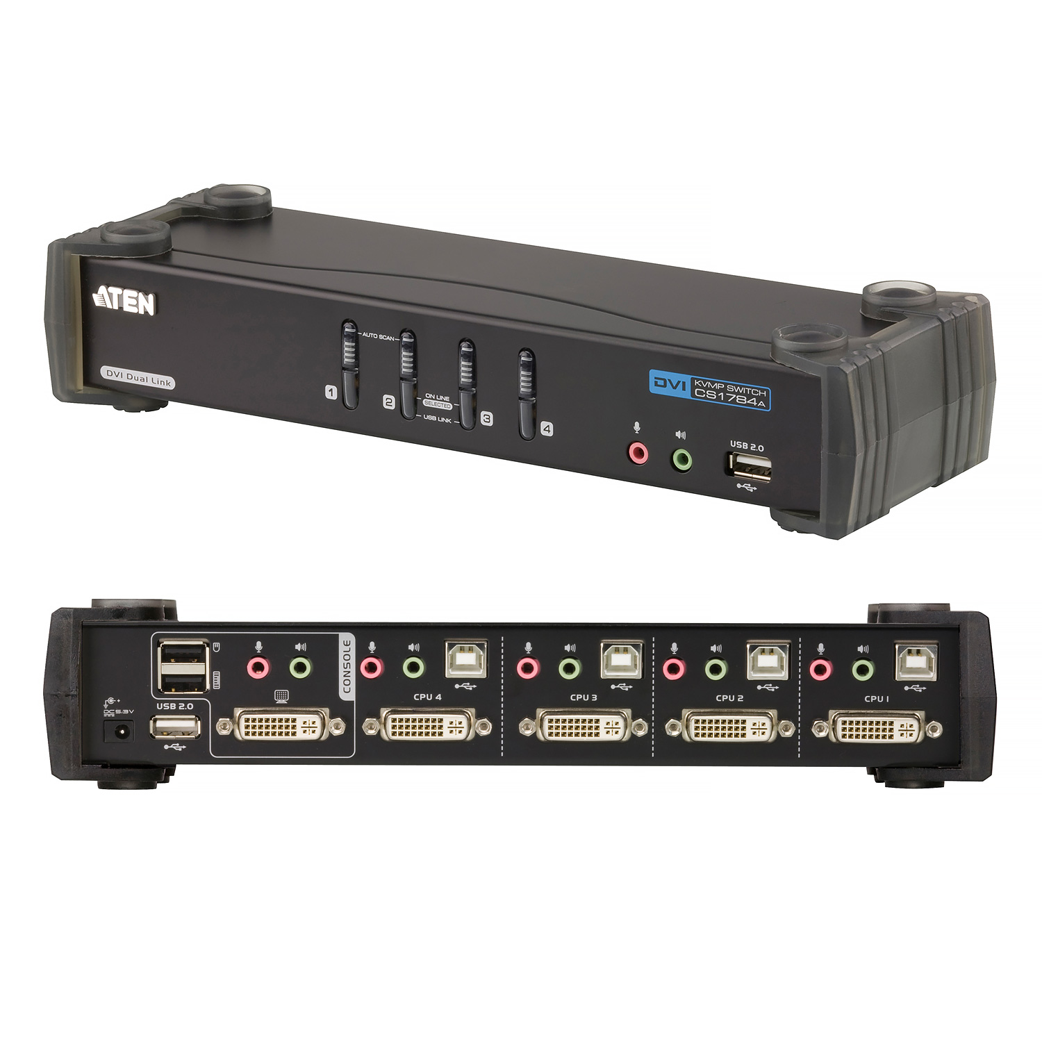 KVM Switch, 4 Port (DVI-I Socket, USB Type A, Speaker Audio Jack, Microphone Audio Jack), Supports up to 2560 x 1600 Resolution, Auto Scan Mode for monitoring all computers